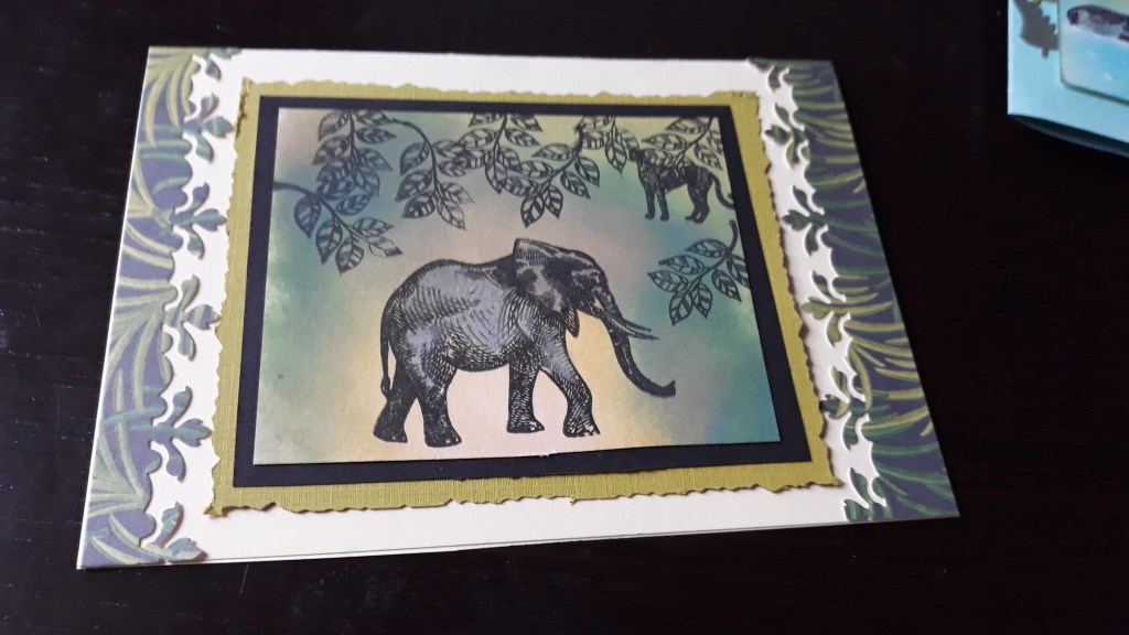 These are a few of my ink blended backgrounds for jungle animal themes. Great fun, if messy, and so many different ways and colour themes to use them with. Still building my collection of distress inks, learning about the various types and also black silhouette stamping brings them out.